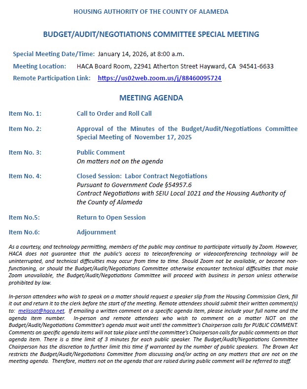 « All Events Budget/Audit/Negotiations Committee Special Meeting January 14 @ 8:00 am - 9:00 am « *CANCELLED* Housing Commission Regular Meeting Office Closed – HACA is closed every other Friday » Add to calendar Google Calendar iCalendar Outlook 365 Outlook Live Details Date: January 14 Time: 8:00 am - 9:00 am Event Category: Commission Meetings