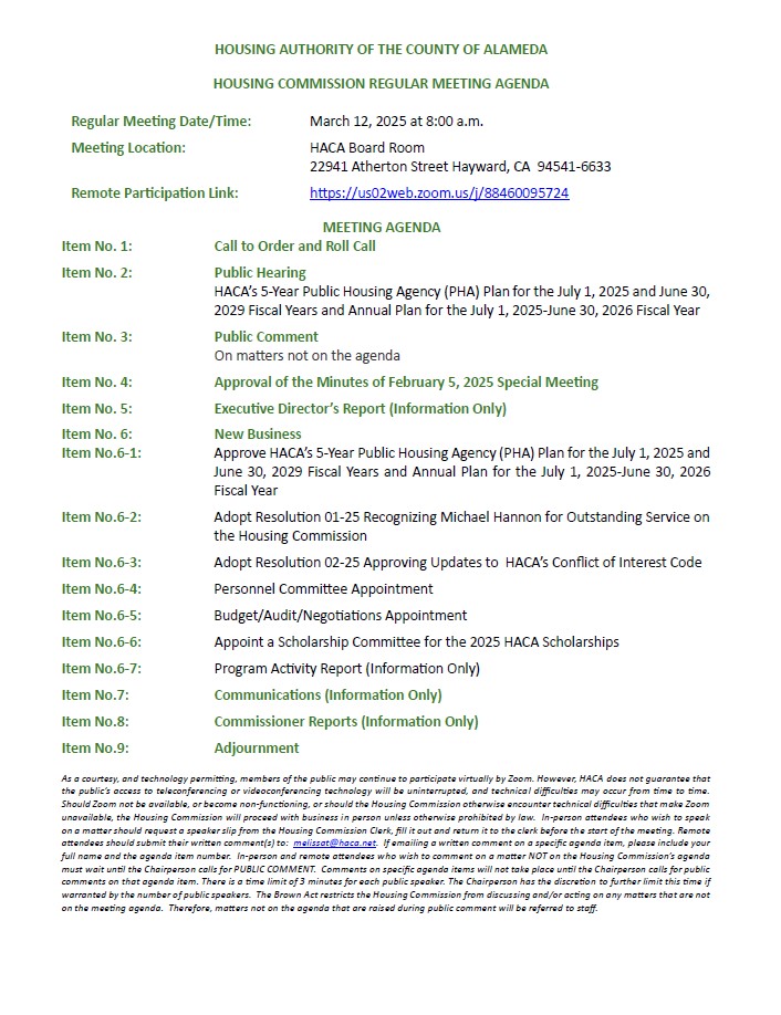 « All Events This event has passed. Housing Commission Regular Meeting – 3/12/2025 March 12 @ 8:00 am - 9:00 am « Office Closed – HACA is closed every other Friday Office Closed – HACA is closed every other Friday » Add to calendar Google Calendar iCalendar Outlook 365 Outlook Live Details Date: March 12 Time: 8:00 am - 9:00 am
