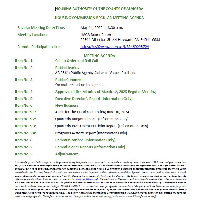 « All Events This event has passed. Housing Commission Regular Meeting May 14 @ 8:00 am - 9:00 am « Personnel Committee Special Meeting Budget/Audit/Negotiations (BAN) Committee Meeting » Add to calendar Google Calendar iCalendar Outlook 365 Outlook Live Details Date: May 14 Time: 8:00 am - 9:00 am Event Category: Commission Meetings Venue HACA Board Room 22941 Atherton Street Hayward, CA 94541 United States + Google Map