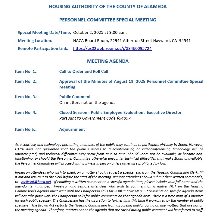 « All Events This event has passed. Personnel Committee Special Meeting October 2 @ 9:00 am - 10:00 am « Office Closed -HACA is closed every other Friday ** CANCELLED ** Housing Commission Regular Meeting » Add to calendar Google Calendar iCalendar Outlook 365 Outlook Live Details Date: October 2 Time: 9:00 am - 10:00 am