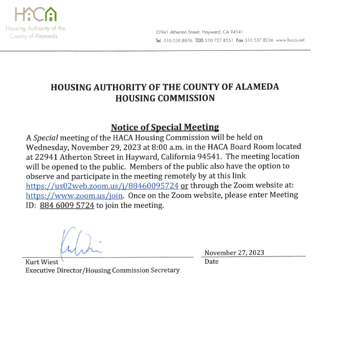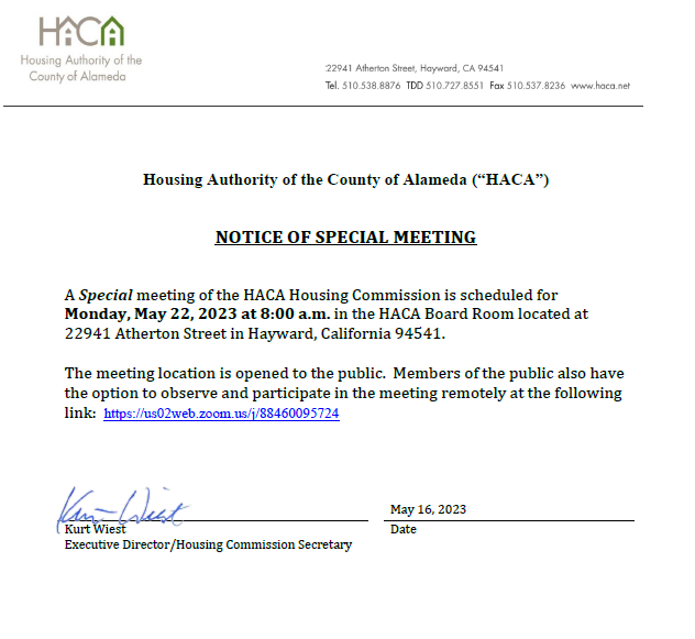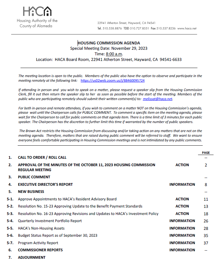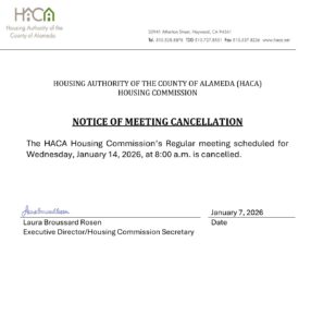 HACA’s Housing Commission meets in person in the HACA Board Room located at 22941 Atherton Street, in Hayward. As a courtesy, and technology permitting, members of the public may participate virtually by Zoom. However, HACA does not guarantee that the public’s access to teleconferencing or videoconferencing technology will be uninterrupted, and technical difficulties may occur from time to time. Should Zoom not be available, or become non-functioning, or should the Housing Commission otherwise encounter technical difficulties that make Zoom unavailable, the Housing Commission will proceed with business in person unless otherwise prohibited by law.